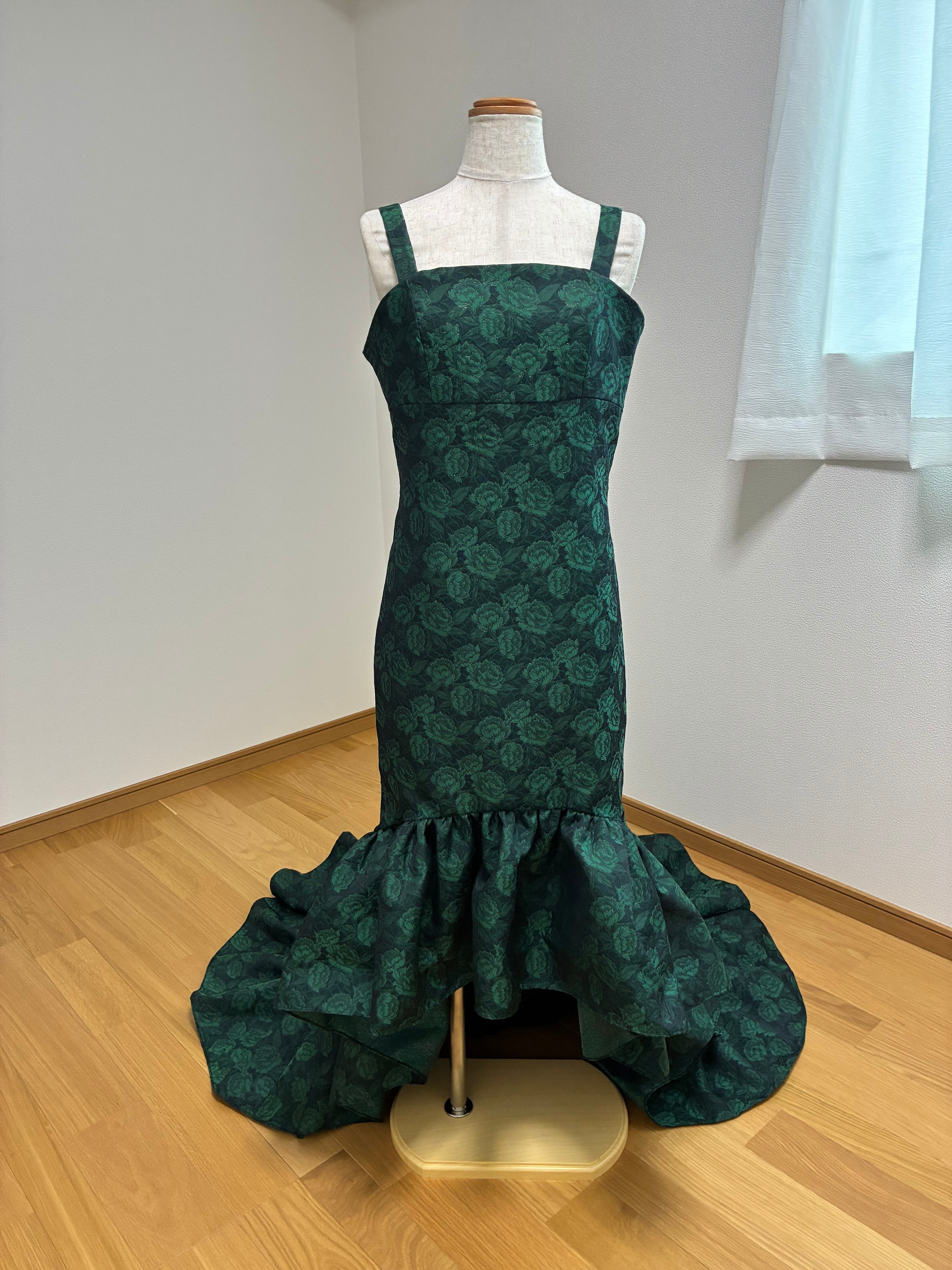 美しいフィッシュテールデザインが特徴のドレス。裾にたっぷりギャザーを施し流れるようなシルエットと、足元が見えるデザインです。